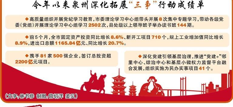 将深化拓展“三争”行动作为贯穿全年工作的主轴主线。今年以来,泉州持续加强工作专班,明确各项任务时间表、路线图,围绕事关全局发展的重点难点堵点问题,全市广大干部以拼的姿态、抢的劲头、实的作风抓项目、促发展,推动各领域工作争先进位创一流,拼出跨越赶超的“泉州速度”。