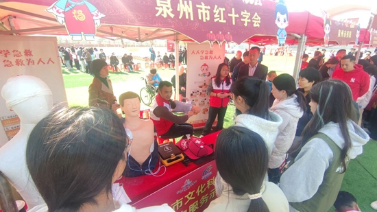 在泉州医高专南安校区内,泉州市和南安市红十字会工作人员以及红十字青年文明志愿者积极宣传“人道、博爱、奉献”的红十字精神,通过设立宣传咨询台,发放宣传材料,现场向群众和学生普及红十字运动、无偿献血、造血干细胞捐献、遗体和人体器官捐献、应急救护、垃圾分类、文明餐桌等知识,讲解心肺复苏的基本操作和急救方法,与群众和学生进行面对面的沟通交流,进一步提升群众和学生的生命安全知识和健康素养水平。
