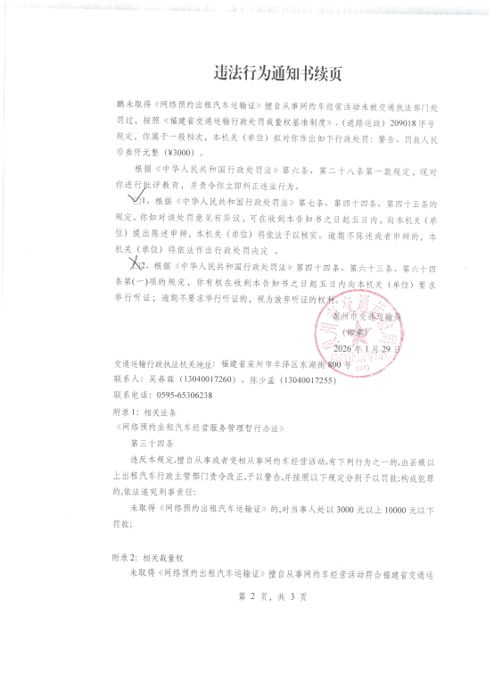 本机关于2026年01月29日对你未取得《网络预约出租汽车运输证》擅自从事网约车经营活动一案拟作出警告、罚款人民币叁仟圆整的行政处罚决定。同时,根据《中华人民共和国行政处罚法》第六条、第二十八条第一款规定,现对你进行批评教育,并责令你立即纠正上述违法行为。