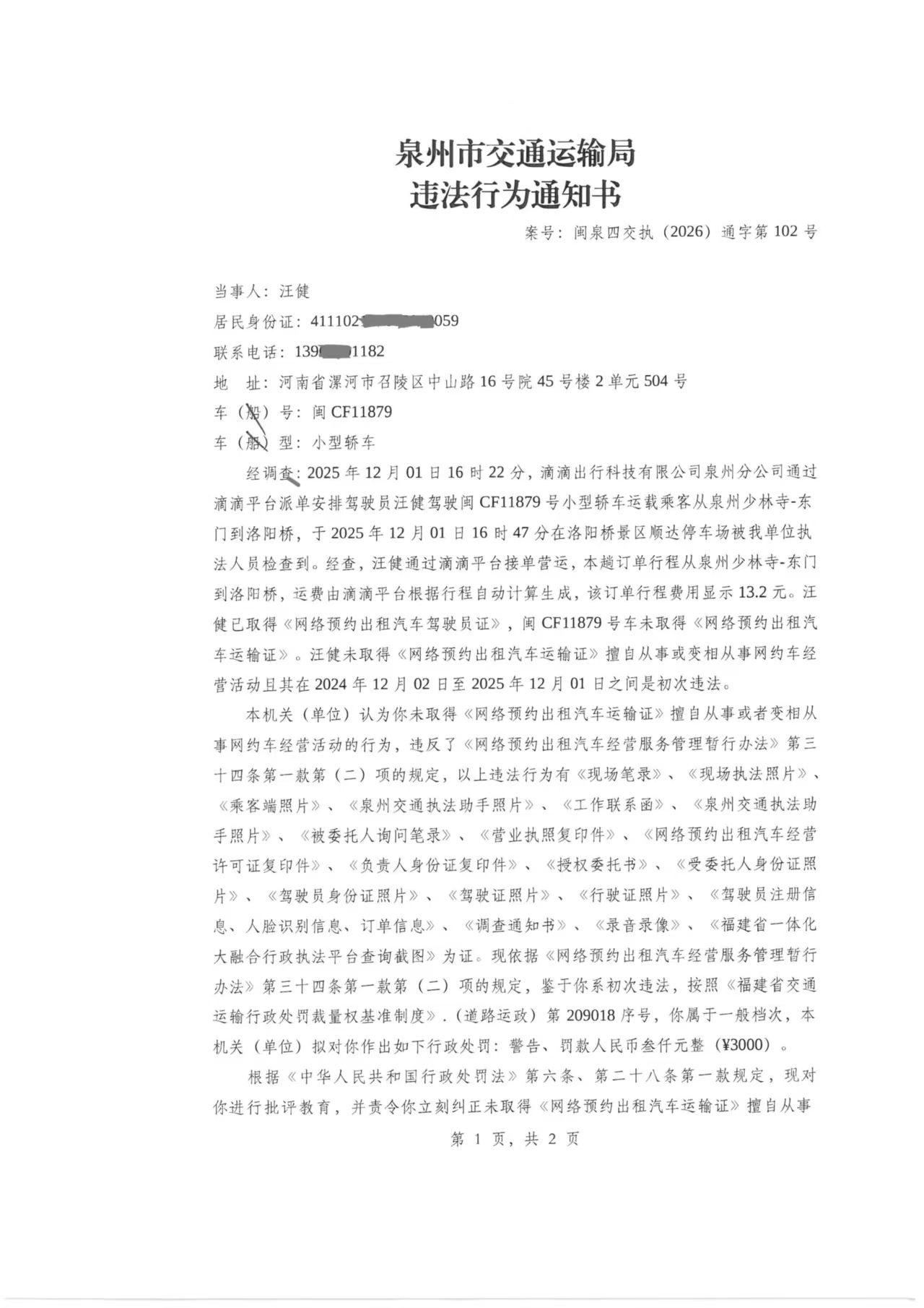 附件:《违法行为通知书》{闽泉四交执(2026)通字第102号}