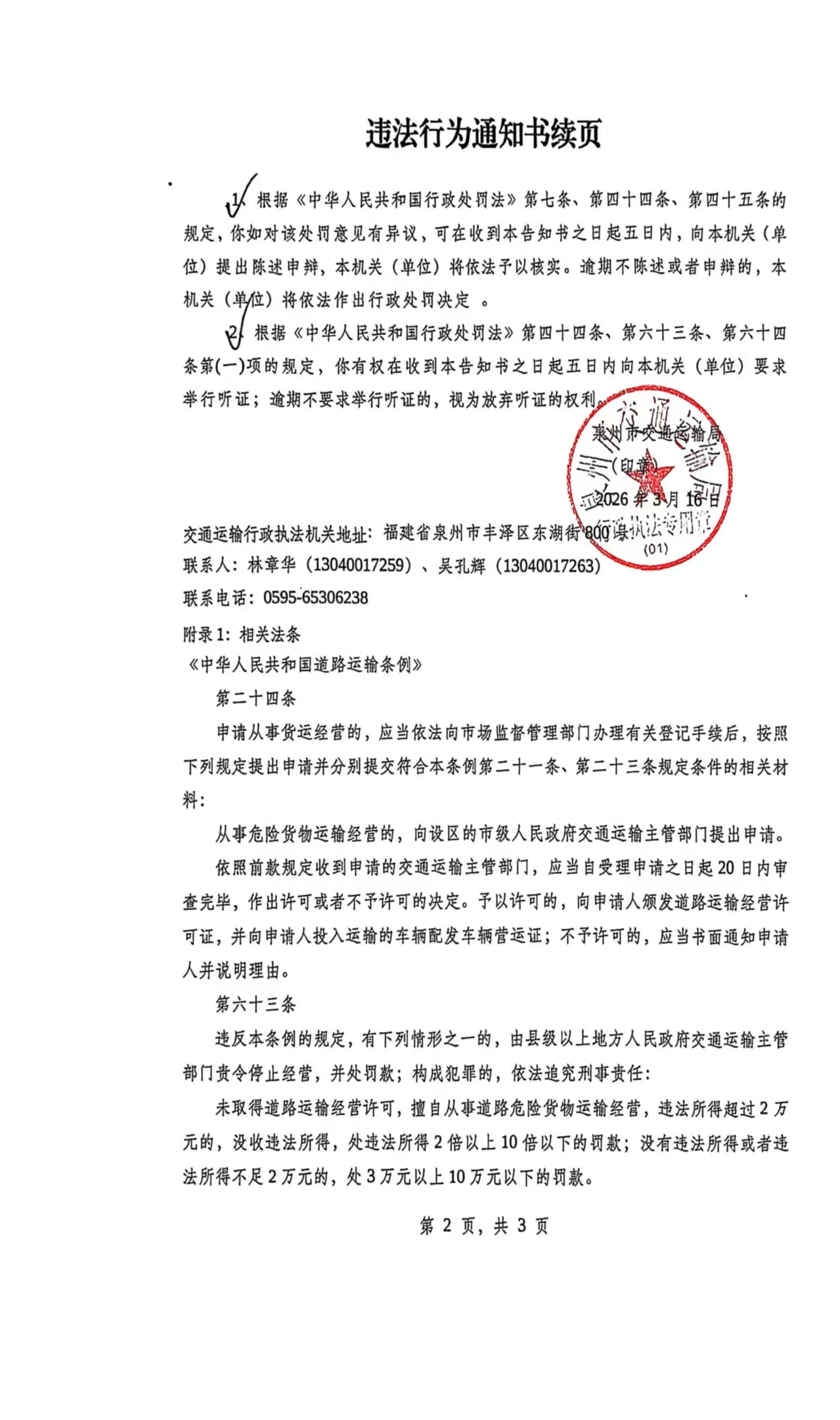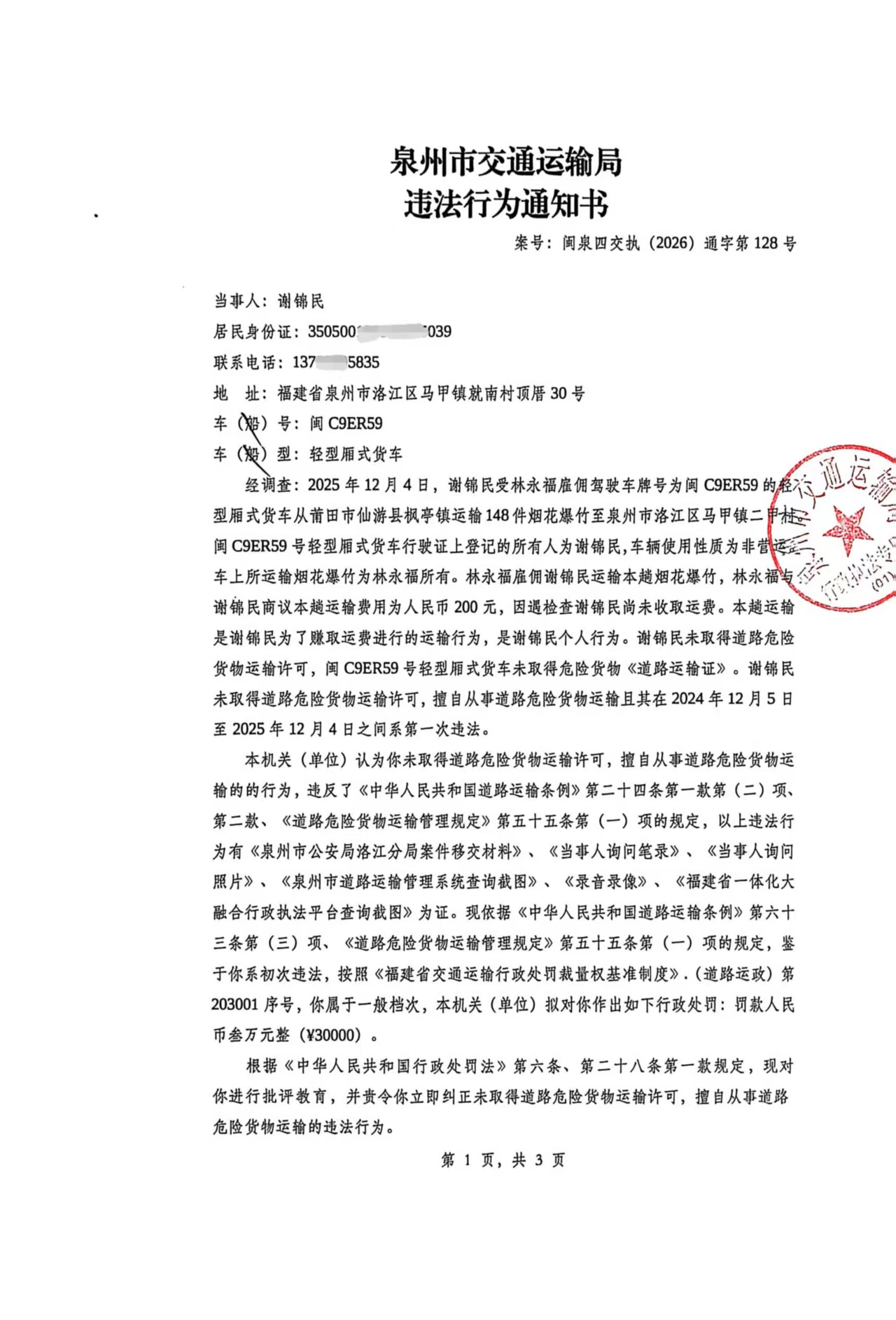 附件:《违法行为通知书》{闽泉四交执(2026)通字第128号}