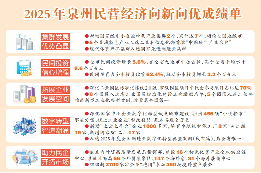 “泉州鼓励民营企业加强创新、加大投资,带动民营经济实现数量和质量双提升。”市发改委有关负责人介绍,近年来,泉州持续出台“1+N”政策体系,打造“泉心泉意”营商服务品牌,通过强化创新驱动、聚焦产业升级、优化营商环境、深化政企互动、完善要素保障等一系列举措,持续塑造民营经济发展新动能、新优势,全力激发民营经济活力。