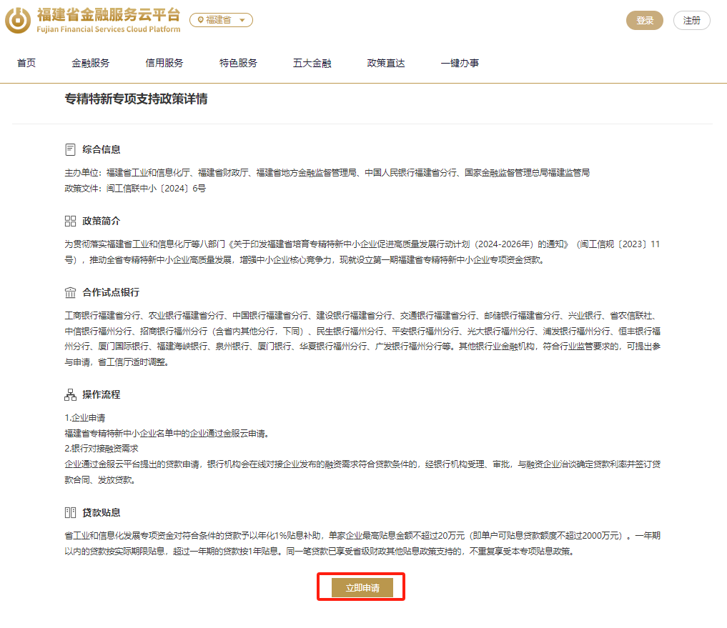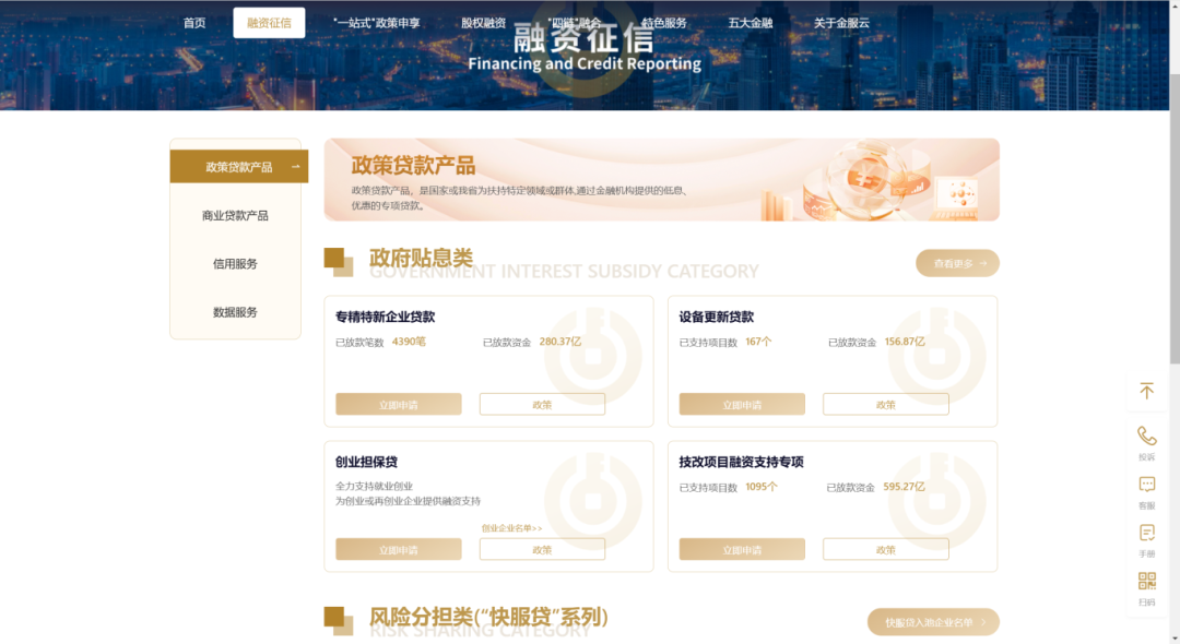 第一步:登录“金服云”平台官网,在国产视频的“政策支持专项”中找到“专精特新企业贷款”;点击【政策】后,即可跳转至政策详情页,查看政策内容。