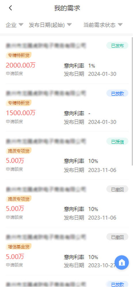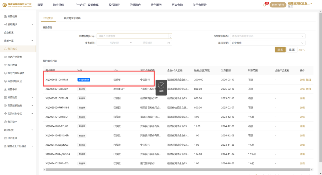 第四步:提交需求后,可在【我的需求】页面查看需求状态。需求发布之后状态为【已发布】,后续需求由银行进行操作。