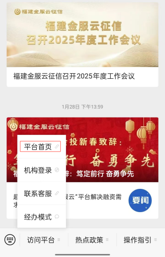 第一步:登录微信公众号“福建金服云”,点击【平台国产视频】,即可跳转至国产视频。