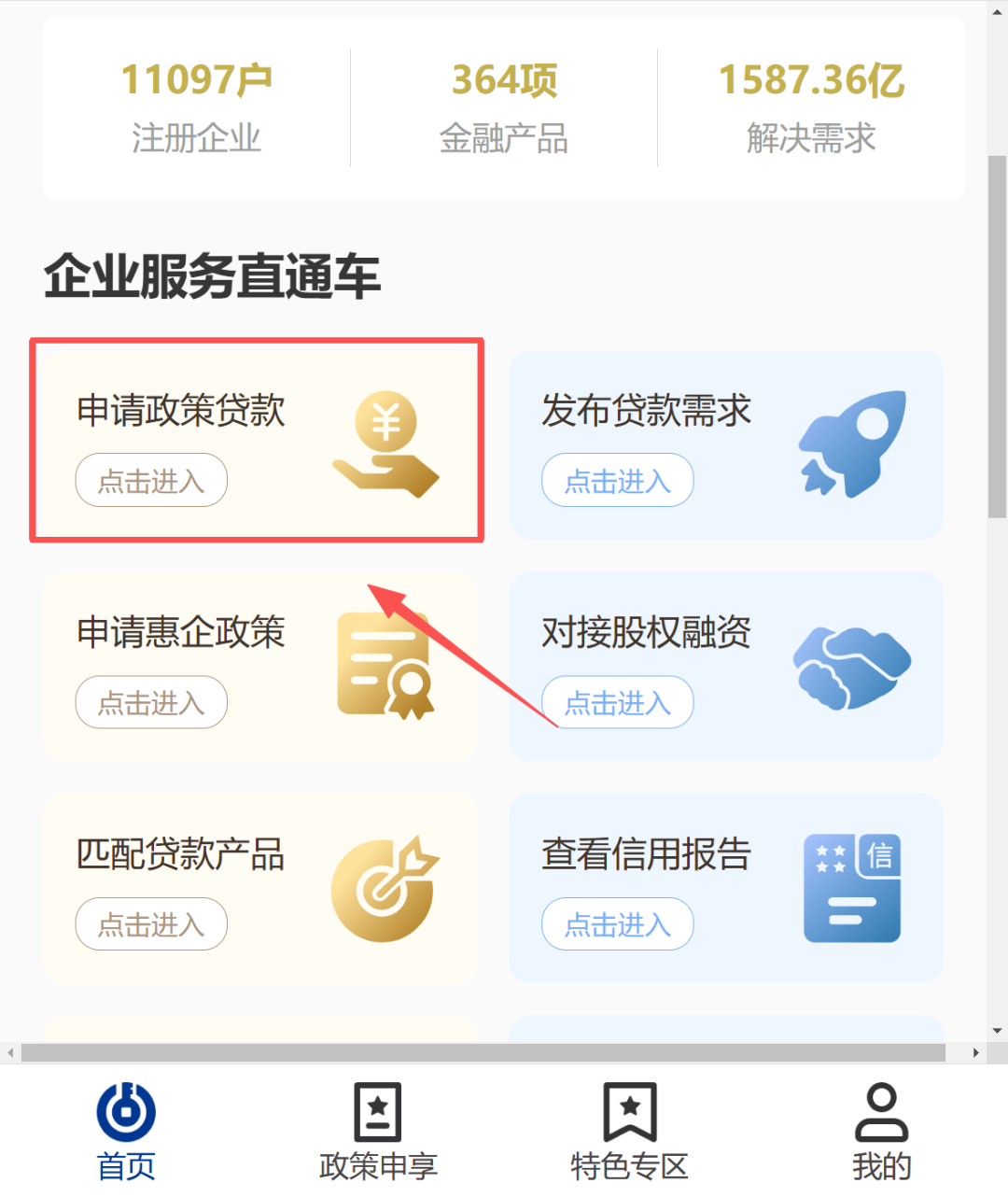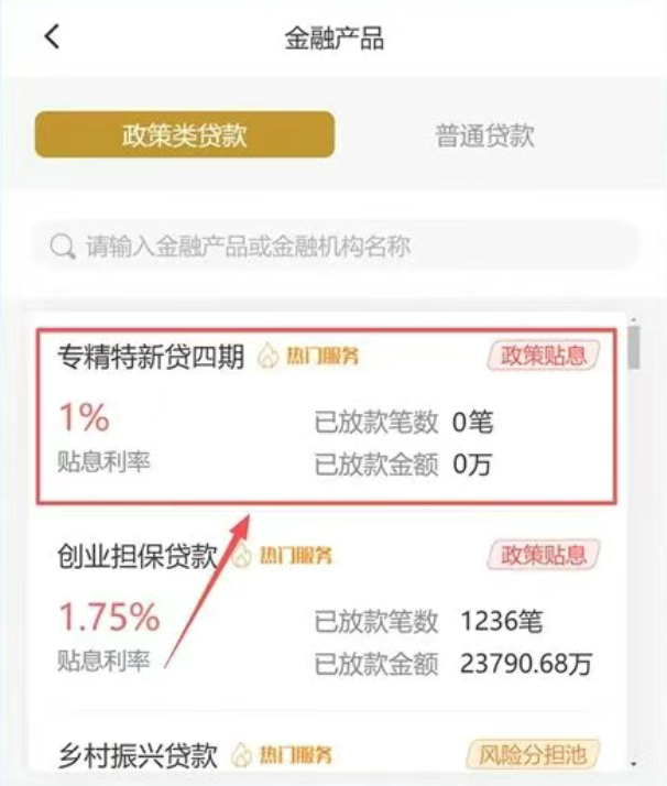 第二步:在申请政策贷款专项栏中,找到“专精特新贷”,点击进入政策。