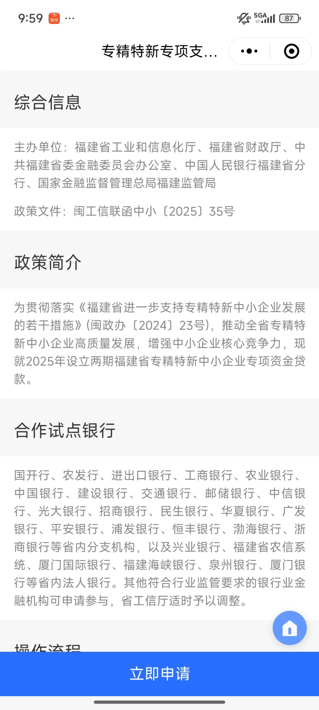国开行、农发行、进出口银行、工商银行、农业银行、中国银行、建设银行、交通银行、邮储银行、中信银行、光大银行、招商银行、民生银行、华夏银行、广发银行、平安银行、浦发银行、恒丰银行、渤海银行、浙商银行等省内分支机构,以及兴业银行、福建省农信系统、厦门国际银行、福建海峡银行、泉州银行、厦门银行、福清泰隆村镇银行等省内法人银行。其他符合行业监管要求的银行业金融机构可申请参与,省工信厅适时予以调整。