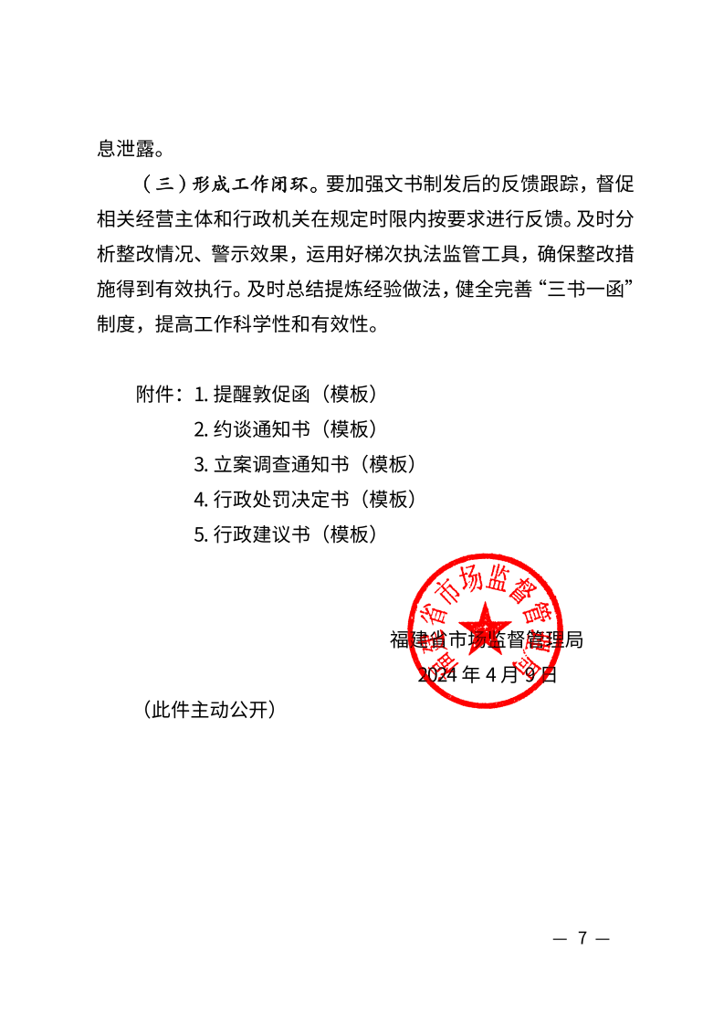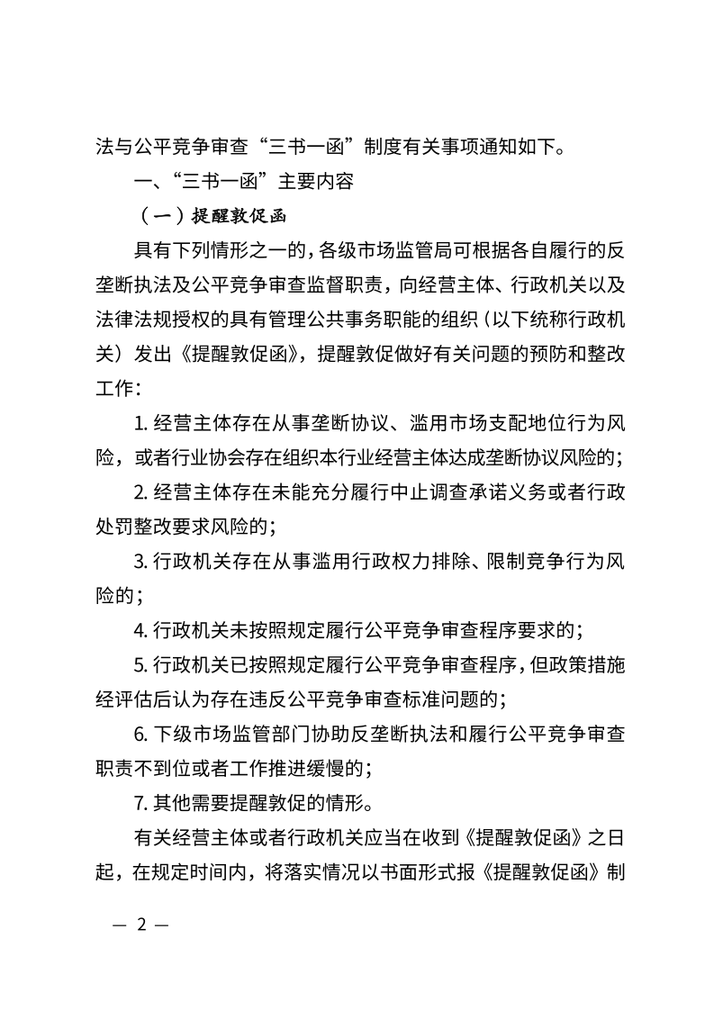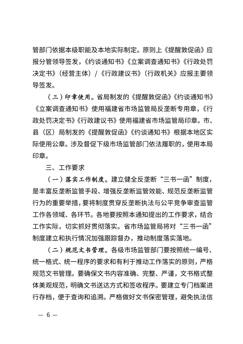 现将《福建省市场监管局关于建立反垄断执法与公平竞争审查“三书一函”制度的通知》(闽市监反垄断〔2024〕84号,以下简称《通知》)转发给你们。各地要按照《通知》提出的工作要求,结合工作实际,切实抓好贯彻落实。对具有《通知》中所列需要提醒敦促、约谈的行为,各县(市、区)市场监管局要根据公平竞争审查监督职责,严格依照《通知》中三书一函实施规范,参照省市场监管局“三书一函”模板(见附件)起草、签报、发出本局《提醒敦促函》《约谈通知书》。要加强文书制发后的反馈跟踪,督促相关经营主体和行政机关在规定时限内按要求进行反馈。并按《通知》要求做好相关情况的抄送、通报、存档等工作。