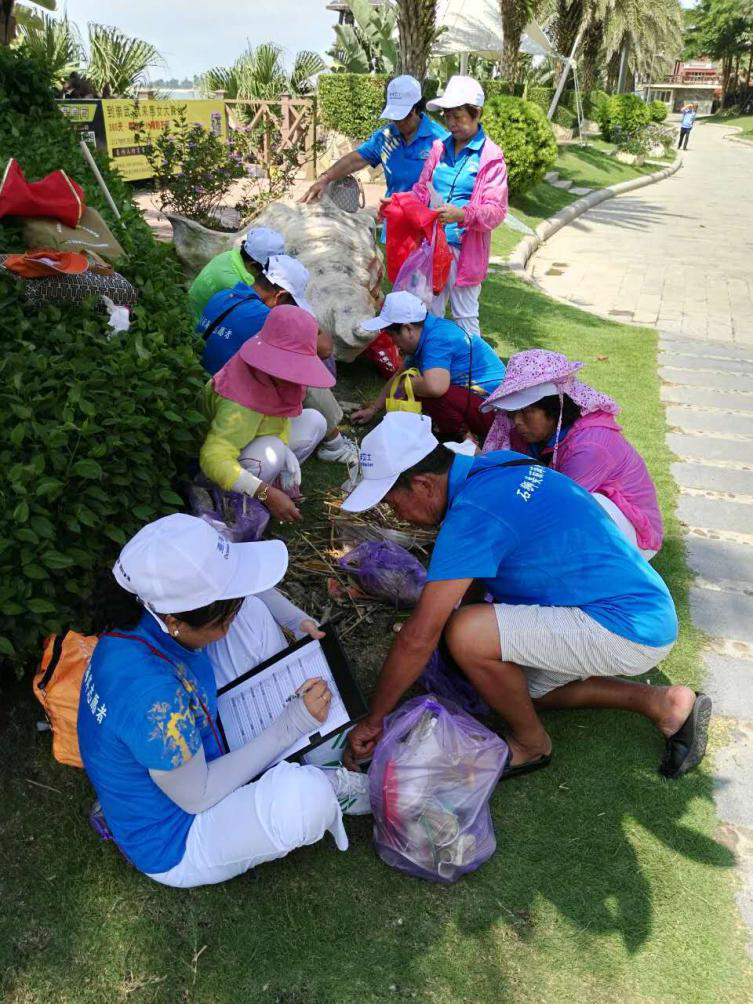 图为志愿者在净滩后进行垃圾分类统计