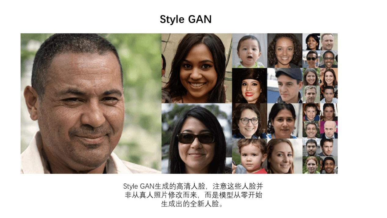 虽然原理比较简单,但GAN的训练非常困难。在原始的GAN论文中,生成的图片其实质量也不高。但随后大量研究团队从不同方向上做了改进,让GAN产生了很多变体。其中,相当有名的是StyleGAN,它能生成极为逼真的人脸。这些人脸和任何已有的人脸都不相同,是由计算机全新创作出的面孔。