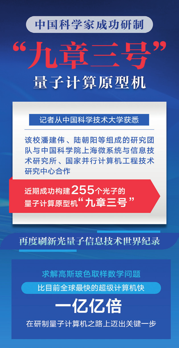 10月11日,中国科学家宣布成功构建255个光子的“九章三号”量子计算原型机,求解高斯玻色取样数学问题比目前全球最快的超级计算机快一亿亿倍,确立新的算力里程碑。