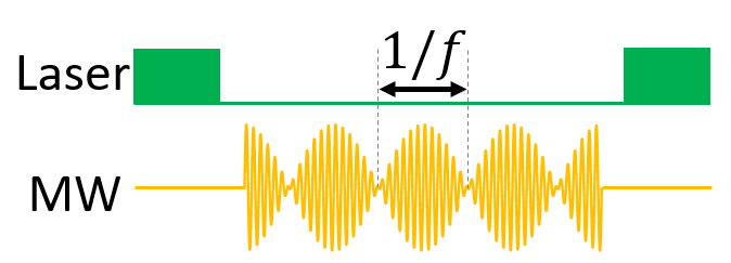 这种序列会在NV色心上产生一系列等间隔的能级,间隔大小为调制频率f,以黑色箭头标示。实验中扫描调制频率f,使其与被测目标的能级ω匹配,发生共振。