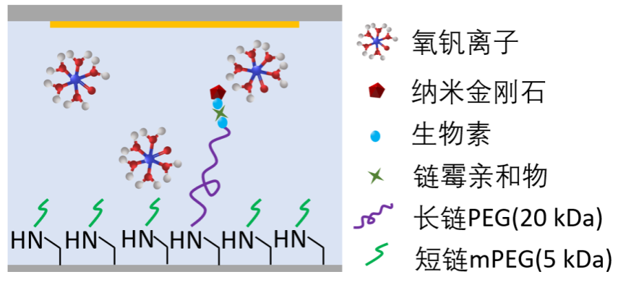 本工作在原位条件下,对纳米金刚石所处溶液环境中的离子进行了顺磁共振谱测量。为了模拟纳米金刚石在细胞内的运动,研究人员用长链分子将纳米金刚石“拴”在基底上,限制其平动范围,但保留转动自由度。这种纳米金刚石可以深入目标内部进行探测,实验中选定被测目标为氧钒离子溶液。当纳米金刚石存在转动时,难以对NV色心进行精确的量子操控,但应用幅度调制微序列,依然能够测得氧钒离子的零场顺磁共振谱,实验示意图和结果如图2所示。这一结果从原理上证明了用纳米金刚石中的NV色心实现细胞内生理原位磁共振探测是可行的。