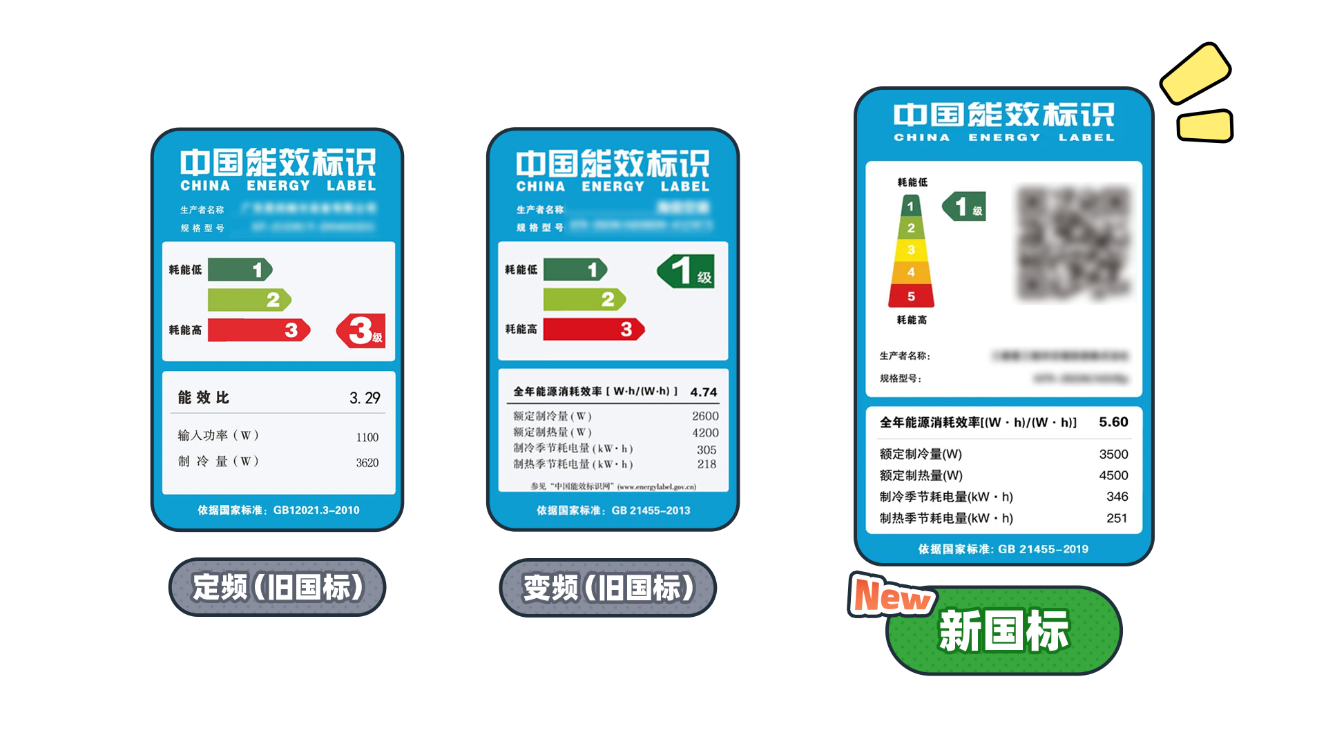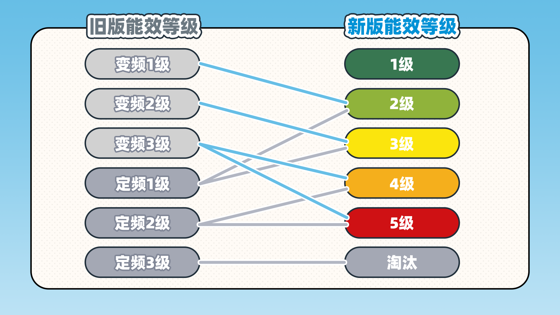 2020年,GB 21455-2019《房间空调调节器能效限定值及能效等级》正式实施。新标准将定频和变频空调的旧能效标准合二为一,能效等级从3个级别变为5个级别。