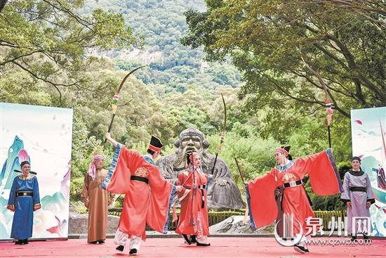 昨日上午9点,在老君岩广场举行的民俗表演,分别为重现传统的宋元祈风祈福仪式、蟳蜅女舞蹈《阮厝在海乾》、宋元文化展示(融合服饰、茶道、香道)、歌伴舞《蓝蓝泉州湾》、合唱《清源山颂》。