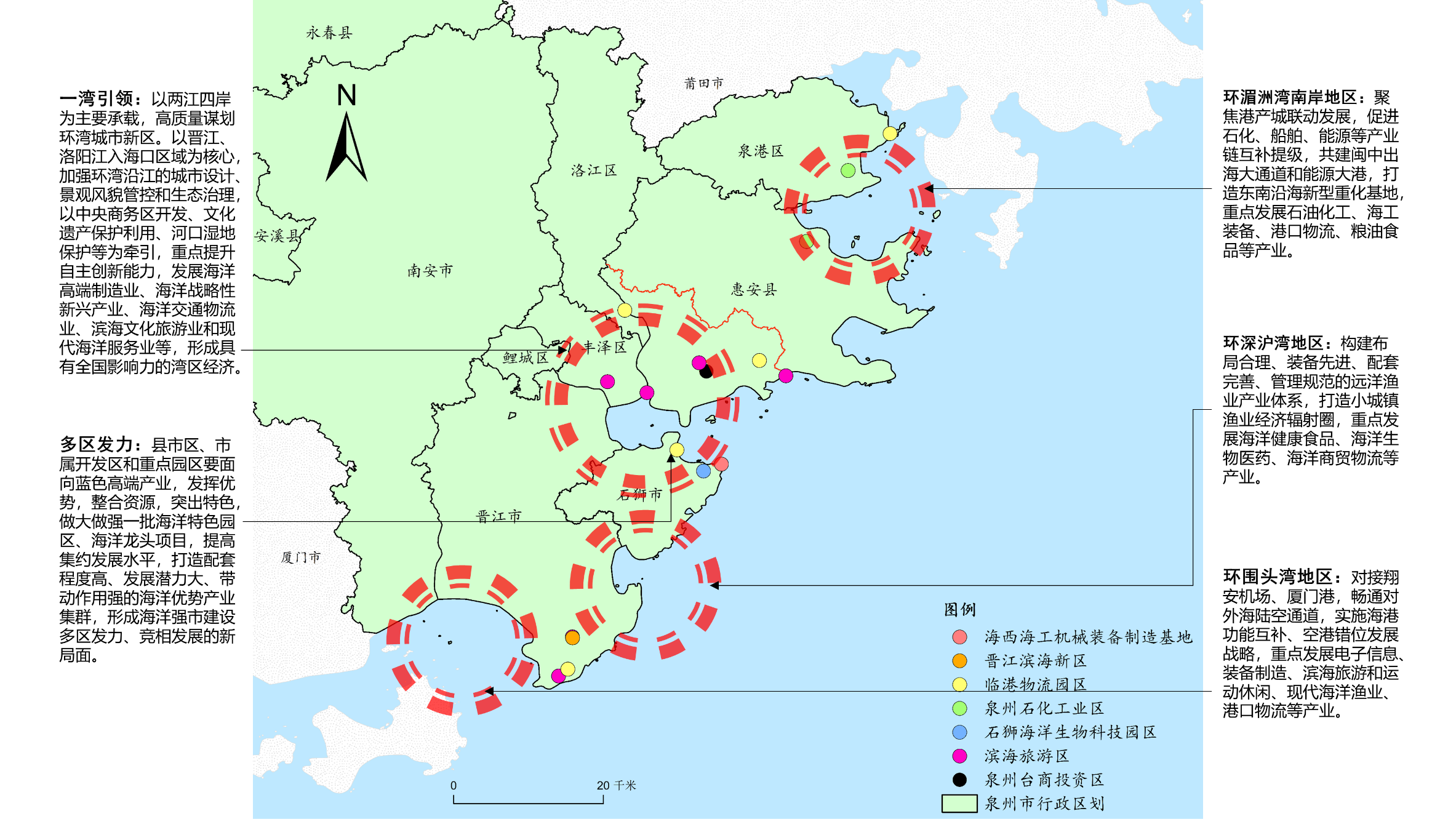 多区发力:泉州台商投资区、泉州(泉港、泉惠)石化工业区、海西(惠安、石狮、晋江)海工机械装备制造基地、晋江滨海新区、石狮海洋生物科技园区、临港物流园区、滨海旅游区。