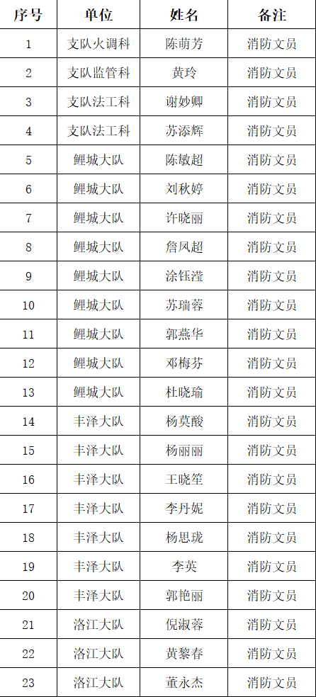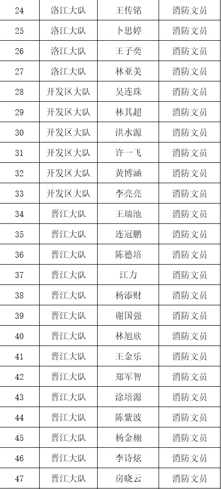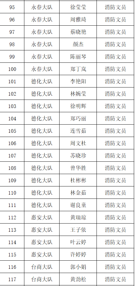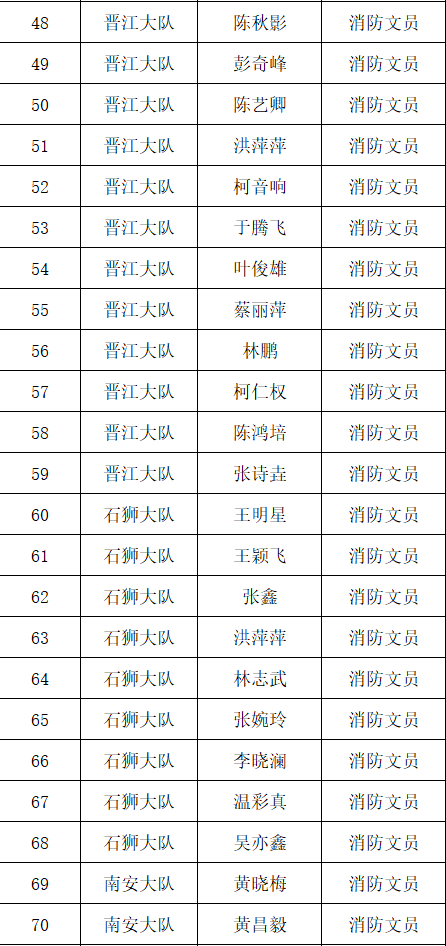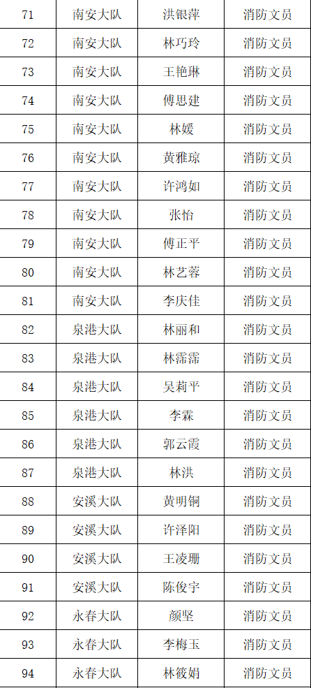 根据《福建省消防条例》关于消防文员从事执法辅助工作的规定,泉州市消防救援支队拟从事消防执法辅助工作的文员进行培训和考试,现将考试合格人员名单公示如下: