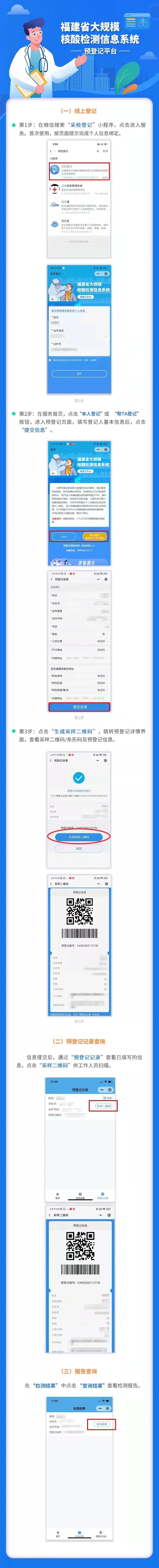 福建省大规模核酸检测信息系统预登记平台正式启用,请市民扫描上方二维码,预填身份信息,完成相关信息采集,以备将来开展大规模核酸检测时,市民可持预登记个人信息后生成的预登记二维码, 至大规模核酸检测现场采样点进行采样检测。
