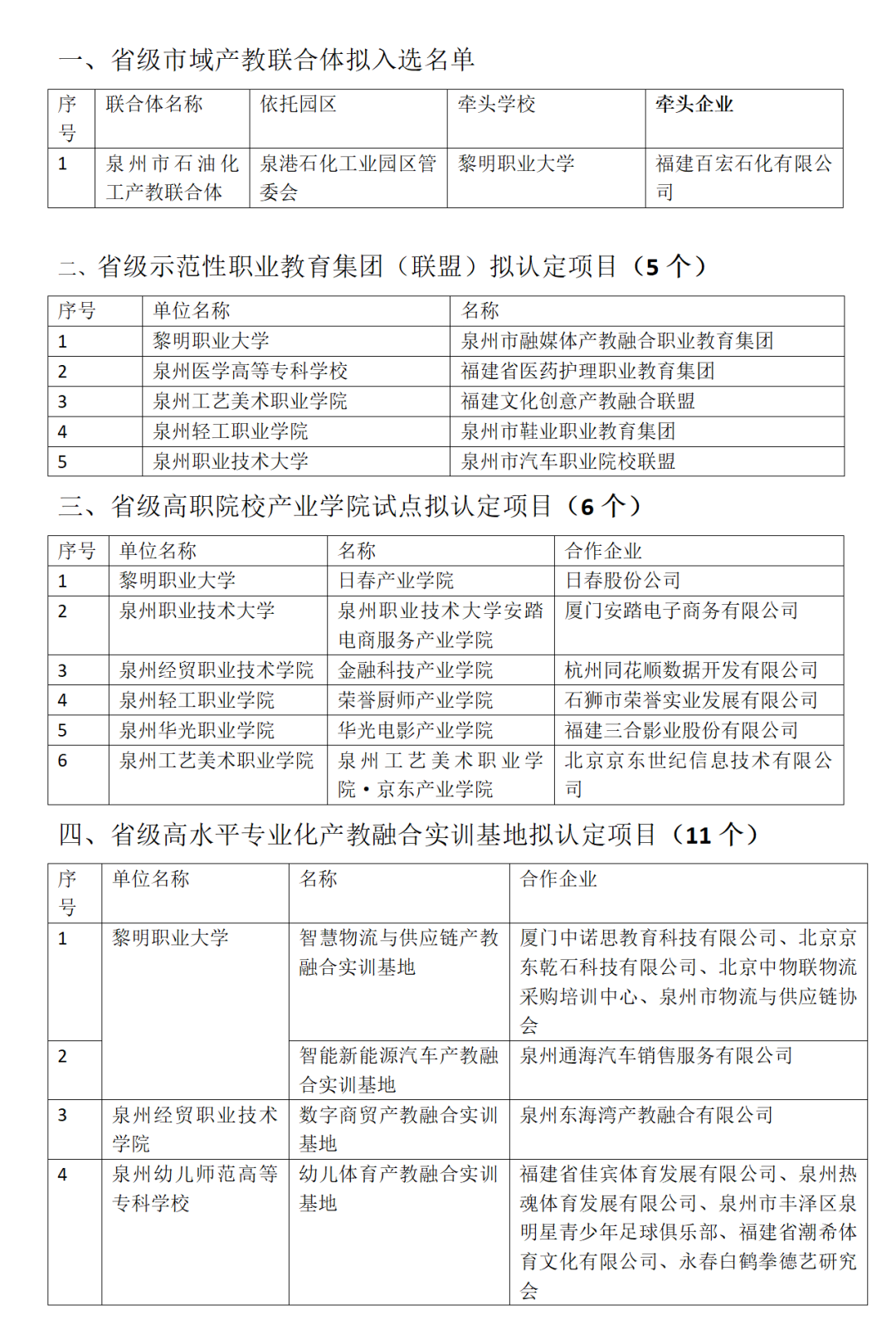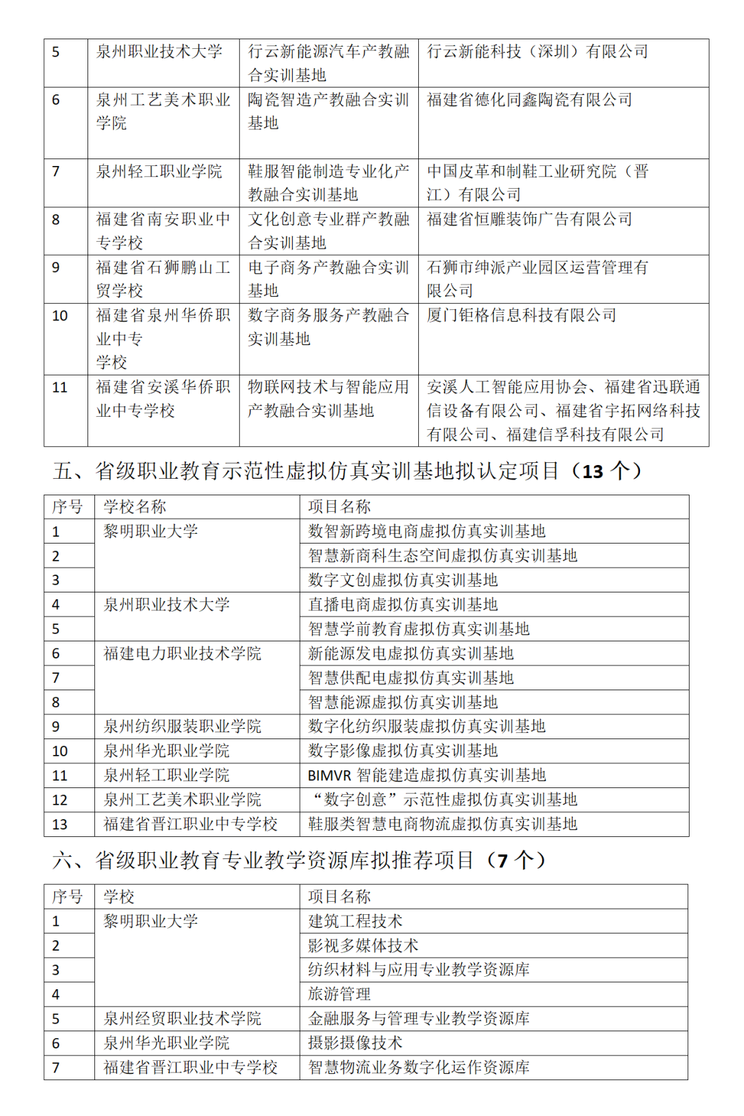 近日,福建省教育厅公布了2023年省级市域产教联合体和职业教育产教融合重点项目评审结果公示名单,泉州市一批重点项目入选公示名单,包括1个省级市域产教联合体,5个示范性职业教育集团(联盟)、6个高职院校产业学院试点、11个高水平专业化产教融合实训基地、13个职业教育示范性虚拟仿真实训基地、7个省级职业教育专业教学资源库。泉州市入选项目数量位居全省设区市第一,其中示范性职业教育集团(联盟)、产业学院、虚拟仿真实训基地等项目入选数量均占全省总量的1/4以上,示范性职业教育集团(联盟)入选数量更是占全省总数的45.5%。