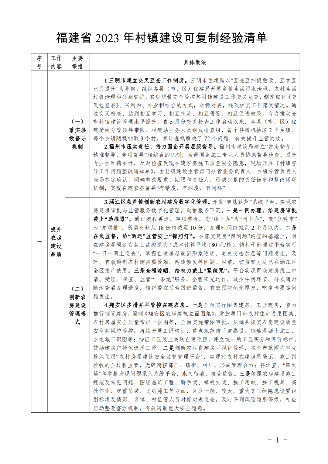 为学习运用“千万工程经验”,持续深化“深学争优、敢为争先、实干争效”行动,激励各地积极作为、守正创新,推动互学互鉴、形成氛围,促进全省村镇建设服务水平和管理效能提升,省住建厅在各地申报的基础上,结合日常资料收集和调研了解,对各地在提升农房建设品质、加强乡村环境治理、深化闽台乡建乡创合作等方面的经验做法进行梳理,形成了《福建省2023年村镇建设可复制经验清单》。其中,泉州市有3个经典案例入选。