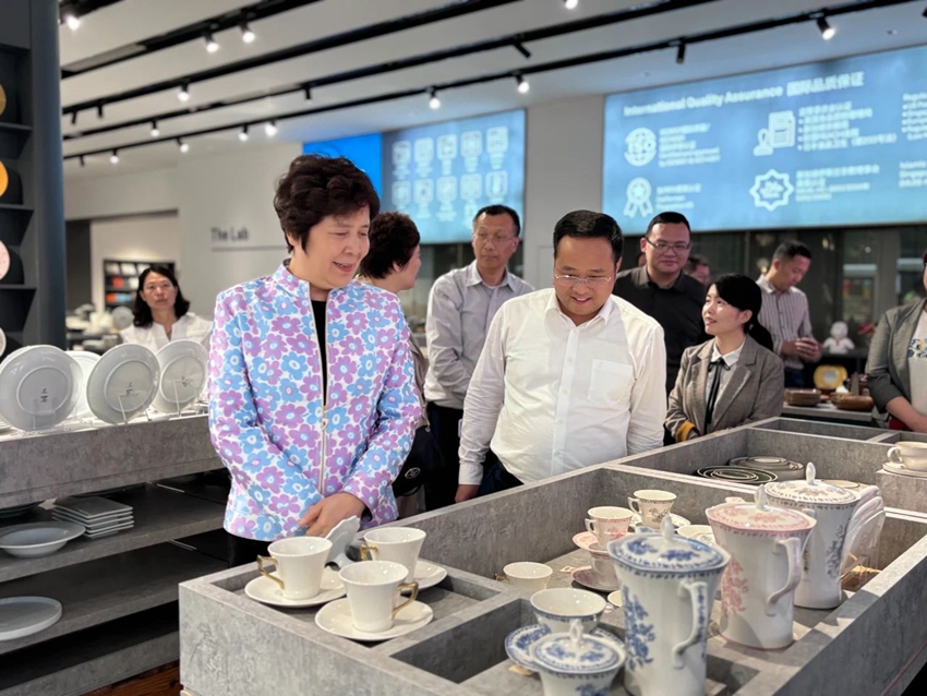 杨柳会长调研的第一站来到了中国瓷都德化。4月24日下午,雨后的德化县城天清气爽,在泉州市相关部门领导及德化县领导的陪同下,杨柳会长一行先后深入五洲陶瓷、陆升集团、德化瓷艺城等地,详细了解德化县陶瓷产业发展、制瓷技艺、外贸出口、产品设计等情况,杨柳会长对德化陶瓷行业守正创新、锐意进取的精神赞叹不已,并对德化瓷与餐饮行业的进一步合作提出意见与建议。