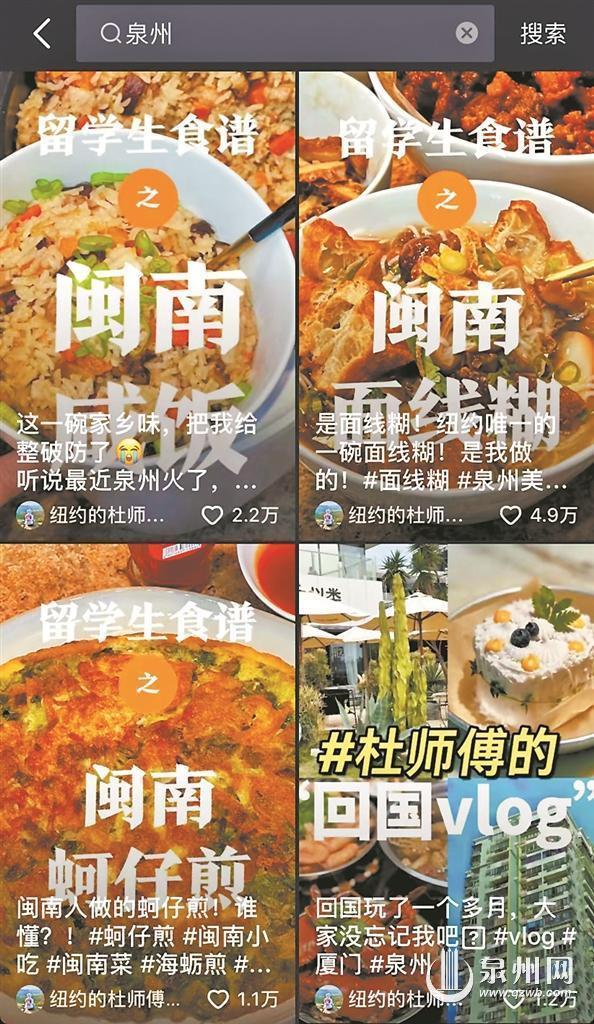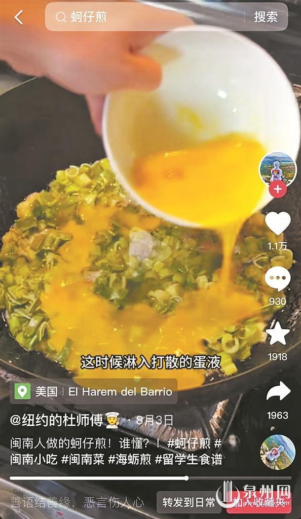 蚵仔煎、卤肉饭、烧肉粽、面线糊……这些泉州人熟悉的传统食物,近两年来被一位正在美国纽约留学的泉州青年小杜搬上线上平台。从食材的选择,到详细的烹法,他通过多个名为“纽约的杜师傅”的账号,在多个社交平台上分享闽南菜做法视频,不但吸引了130多万中外粉丝“打卡”关注、得到数百万点赞,也收获了众多外国粉丝关于“初识闽南菜”的趣味留言。“分享家乡菜食谱的初衷,不单是想借做菜来排解乡愁,还有一个目的是,试试用美国当地超市采购的食材做出中国味道的食物。”在小杜看来,虽然身处异国他乡,却能在当地淘到不少适合做家乡菜的食材,譬如到位于纽约布鲁克林区八大道的市场时,新鲜剥壳的海蛎就令他眼前一亮。煮成海蛎煎,再佐上自己从泉州带过去的辣椒酱,一口入腹,小杜笑言,好似借着味蕾回到了家乡,甚是惊喜。