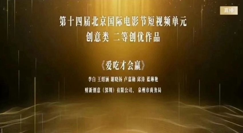 由泉州市商务局出品的泉州美食城市影片《爱吃才会赢》,在4月24日第十四届北京国际电影节上揭晓的短视频单元荣获创意类二等创优作品。