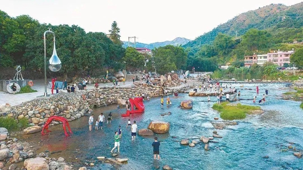 “金谷溪岸的艺术氛围非常浓厚,每一处雕塑都与周围的自然景观相得益彰,让人仿佛置身于一个超大型的大地艺术作品之中。”在金谷溪岸文艺村,王干与潘振平漫步在溪岸,被这里的美景深深吸引。王干表示,金谷溪岸的现代艺术作品展现出更为鲜明的“国际范儿”,它们不仅根植于本土文化的深厚土壤,同时以开放包容的姿态与世界艺术进行着深刻的对话。