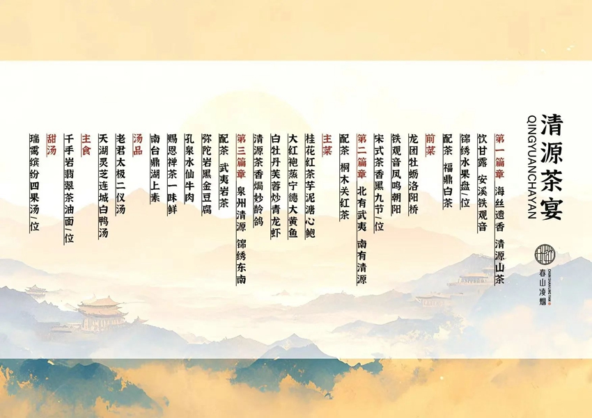 在泉州这座历史悠久且充满生机的城市,千年的传说与每寸土地紧密相连,历史的魅力与茶香相互缠绕。随着文旅新风吹过清源山,一场名为“清源茶宴”,以茶配菜、茶入菜、茶佐菜的新颖形式做成的美食宴席悄然拉开帷幕,邀请您踏上跨越时代的美食之旅。在这里,不仅可以品尝到传统与现代完美结合的精致菜肴,更能深切体会到,在泉州文化旅游发展中,“春山凌烟”清源茶宴研发团队对世界遗产文化的崇高敬意。