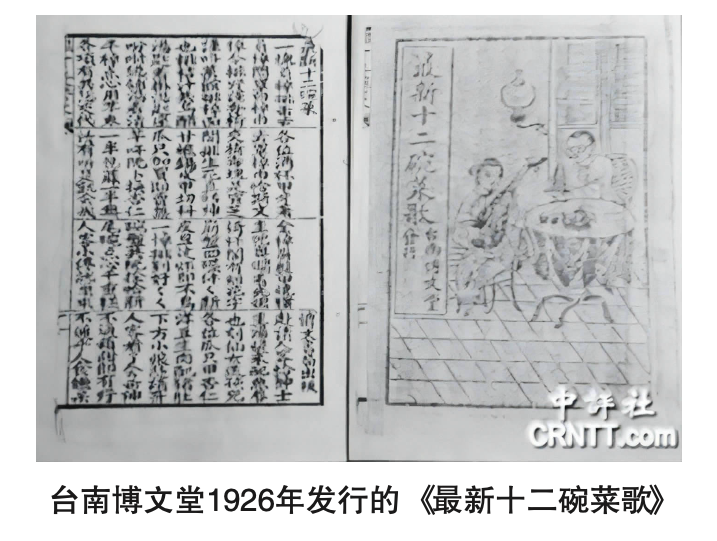 海峡两岸的说唱文学作品“闽南语歌仔册”,常有以美食为题材的。我所见以“十二碗菜”为题的闽南语歌仔册就有多种版本,其中有台南博文堂1926年发行的《最新十二碗菜歌》(见图)。用歌仔册”特有的悠扬曲调,用闽南语歌唱一道又一道美食,想必是“倾听美食”的又一境界也。