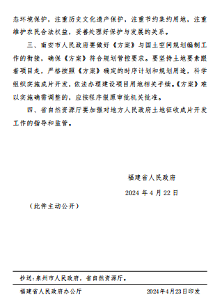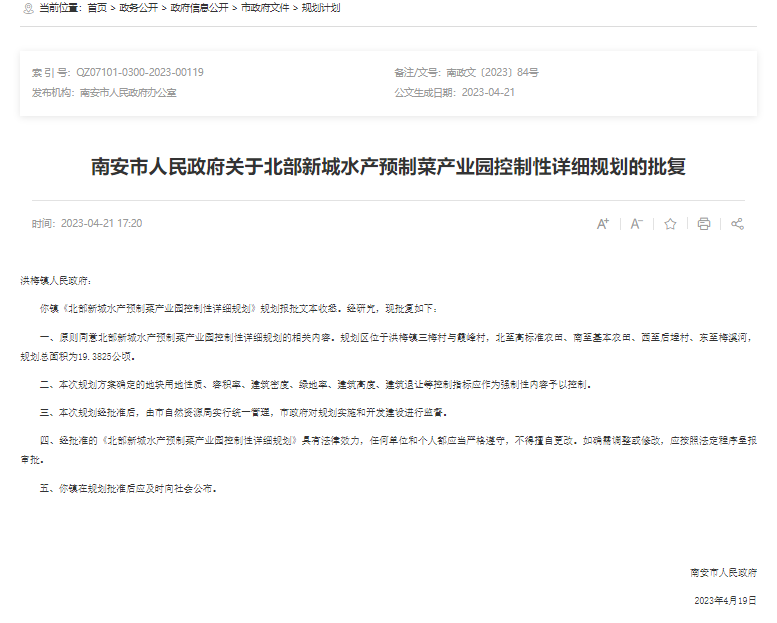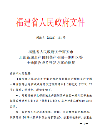 2024年4月22日,福建省人民政府批复同意了《南安市北部新城水产预制菜产业园一期片区等土地征收成片开发方案》。