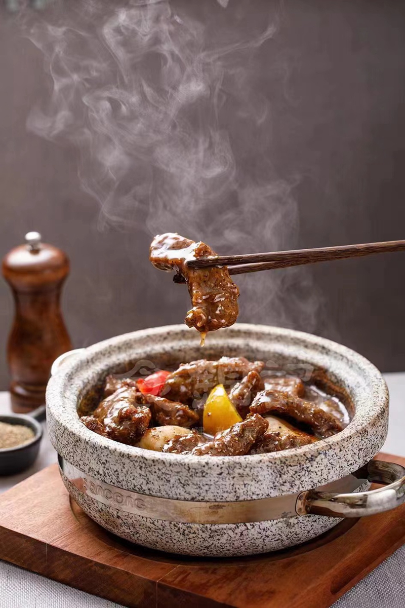 精选牛腰条,横刀切成条,腌制;锅里放入清油烧至低油,放入腌牛肉滑油12秒定型捞出;热锅放入黄油烧至低油温,放入配料炒;石锅底部垫入白雨花石烧至高温,放入炒好配料煸炒出香,放入滑好牛肉,倒入牛肉汁搅拌均匀。成菜特点是牛肉口感嫩滑多汁,黑胡椒味浓郁。