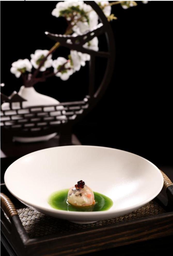 以鲈鱼、花蟹、虾为主料,将配料过水备用;鲈鱼粒、虾仁下少许低味研制入味,过好水的辅料炒至干香与鲈鱼粒花蟹肉、虾仁拌均匀做馅料备用;以生粉为皮将馅料兜入其中,入蒸笼蒸即可。成菜特点是色泽透亮、清鲜爽淡。