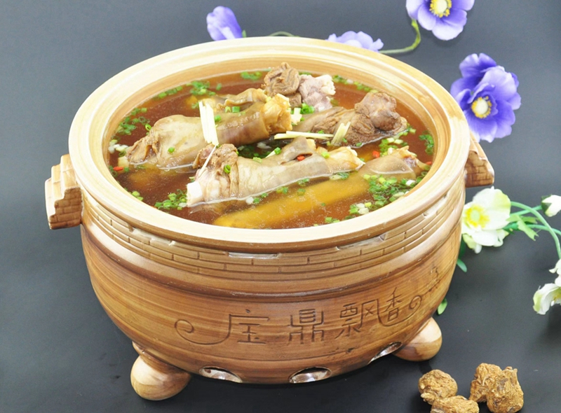 精选黑山羊,将羊小腿、羊蹄烧毛砍件洗干净待用;羊蹄焯水,撇净浮沫捞出冲水待用;锅中下油加入姜片爆香,下羊蹄炒香下配料;砂锅羊蹄汤加入四物等中药材煲一定时间,捞出装盘下姜条、葱花即可。成菜特点是汤汁鲜香浓郁,滋补养生,营养丰富,男女老少皆宜。