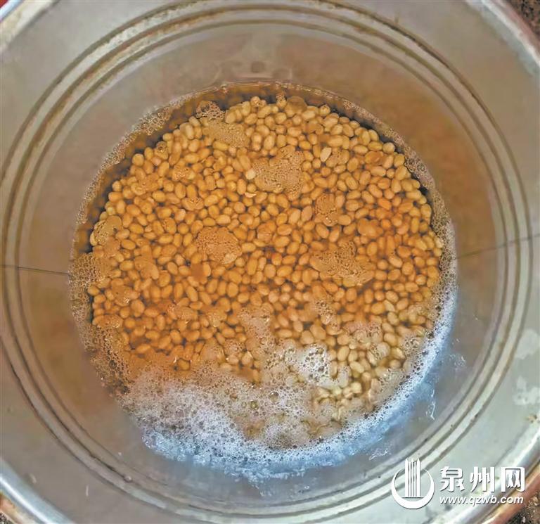 制作豆干前先将饱满黄豆浸泡一夜,让它吸足水分、涨得鼓圆。