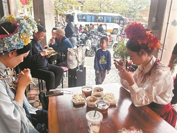 与此同时,涂门街的一家牛排馆内也坐满了食客,其中不乏慕名而来的游客。“牛排卤得非常入味,肉质软烂而不失嚼劲,配上香糯可口的咸饭,相当好吃。”头戴簪花围的宋小姐和李小姐一边吃一边不忘拍照分享美食给朋友们。她们来自四川和浙江,由于朋友极力推荐泉州的美食和文化,便相约在正月初二抵达泉州游玩。“泉州过年很有氛围,美食也很接地气,随便走进一条街巷都能品尝到地道的泉州味道。”宋小姐表示。