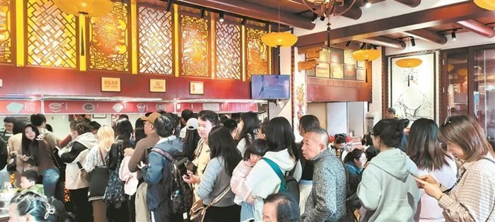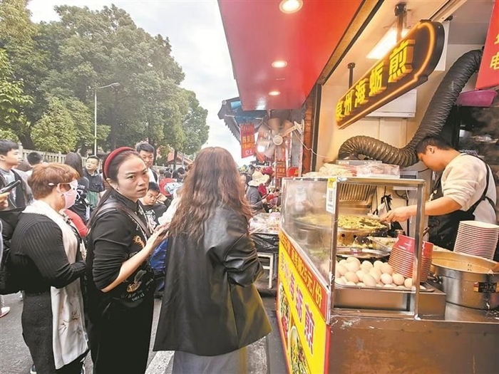 临近中午,涂门街一家姜母鸭店香气四溢。诱人的香味引得游客纷纷驻足,店门口早已排起长龙。“姜母鸭真的很赞,排再长的队等待都值得。还有那个面线糊也很好吃,我都想打包回去。”来自深圳的谢女士表示,泉州的美食让他们感受到了这座城市的烟火气,也让他们感受到了深厚的文化底蕴和历史传承。