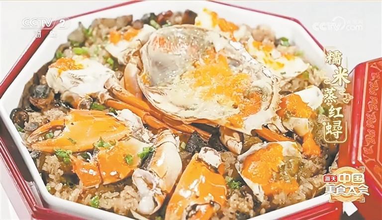 泉州美食制作者胡灿辉带来泉州传统美食“糯米蒸红蟳”。蟹的鲜和谷物的香融合在一起,获美食作家、文化学者欧阳应霁盛赞,也让观众了解到备受游客欢迎的蟳埔中的“蟳”字就是得于红蟳。