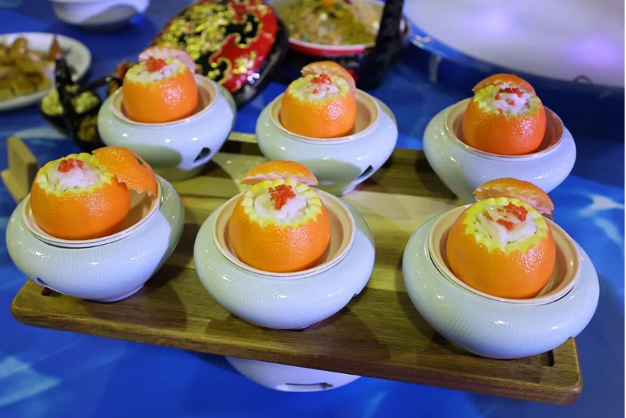 其中,“山海兜”取意于山和水的相遇,以及嫩笋与海鲜的完美结合,如同品味一幅美丽的山水画卷,让人回味无穷;蟹酿橙是南宋御宴上的一道佳肴,山家蟹酿橙使用闽南海蟹,将蟹肉的鲜美与橙子的清香相互融合,形成了独特的口感和风味;通神饼其名字来源于南宋理学家朱熹在《论语集注》中所说的“姜通神明”,由于饼馅中含有少量姜,通神饼在口感上呈现出咸甜之中略带辛辣的特点,这种独特的口感让人回味无穷。