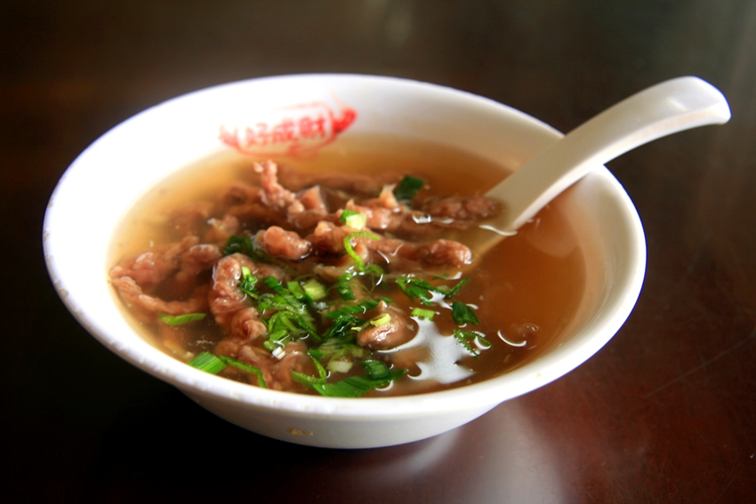 特别是那牛肉羹,善做的厨师,将精挑细选的牛崽肉,按牛肉的纹理走向切好,加料酒、盐巴、味精、葱、姜、蒜、辣等,用劲拿捏,使之入味,再加精地瓜粉适量,搅匀捏抓粘合,等锅里的水烧开以后,拿捏一小团一小团的,分几次放入沸水中,再放入精选的名贵中药制成的配料,待牛肉小团逐一浮上水面,即可装碗。撒上已切段备好的姜丝、葱花,再撒一点胡椒粉,或咖喱粉,一碗热气腾腾、爽滑香甜的牛肉羹,就能一慰你轱辘的饥肠!