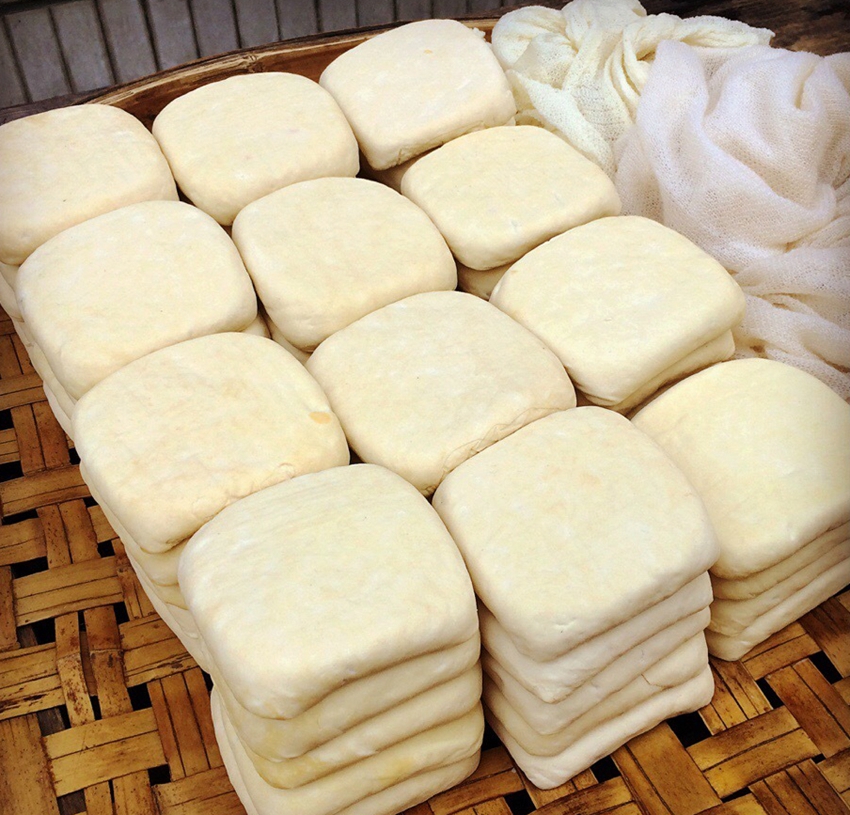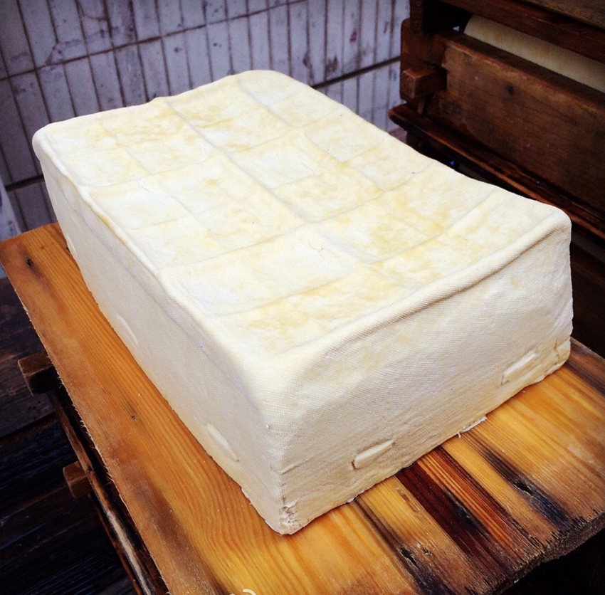 农耕时代,惠安乡下人几乎家家户户都会磨豆做豆腐、豆干。优质天然的黄豆,是自家田地种的,淘洗后,浸泡它一晚上,放自家门口的石磨上磨碎,入锅烧煮,水开时即可放入八角等按方配的中药药水,待豆一煮沸,即用大勺舀入旁边早备好的大木桶中,加入卤水,让豆浆逐渐凝结固化,或舀入专用的豆腐木模中,用大纱巾包裹,而后,再压上一木模,加压,让多余的水分沥出。或用小纱巾包裹,逐个放置在专用的木板模上,分几层放置齐整,再上压一块专用木板,用专制的铁钢卡子卡紧,将设计好的螺丝拧紧,压榨出多余的豆腐水,稍待一小段时间,待豆干完全凝结压紧实后,解开纱巾,豆干出笼。惠安豆腐、豆干以细嫩有味、嚼道好、能反弹、经济实惠而著称,如加入大鱼头炖汤,或加猪肉卤煮,或加海蛎干、紫菜、蚝干烧汤,又或与韭菜配炒,加鸡蛋香炒,等等,都是特别好吃的美食,老少皆宜,让人百吃不厌。