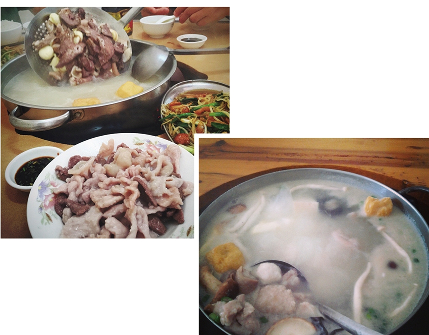 这种永春县城早时贩夫走卒街头巷尾图温饱的普通小吃,居然成为市民百姓围炉聚餐体现亲情的时尚小吃。食客中间放一火锅盆汤,以骨头炖出汤头,十多盘豆腐、萝卜、青菜、肉丸、鸡卷、猪肺片、猪小肠、笋干、腐竹啥的,依食客“萝卜青菜,各有所爱”择物下汤锅,电火锅或旺或微,随时调节,汤滚食材翻,香飘四座,拌以“咯咯”炖汤声,此情此景,才上喉头,却上心头,最是温馨亲切,窝心事、烦心事,全随着“咯咯”声响,随蒸腾的烟水气,烟消云散。油盐酱醋,辣蒜味精,特别是敞量供应的地产永春老醋,更吊你的胃口,让你真切体味酸甜苦辣的人生滋味,“于平淡处见真情,于不经意间起乡思”这才是永春咯摊与别的小吃不一样的地方。