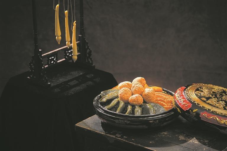 “连中三元”(金丝芋圆酥)是一道地道闽南风味菜肴,以猪肉、笋丁包入芋泥制成丸子,裹上面线入油锅炸至金黄,口感脆爽丰富,色泽金黄贵气,颇有“连中三元”的喜乐之感,也暗合闽南人常说的“食芋好头路”之意。