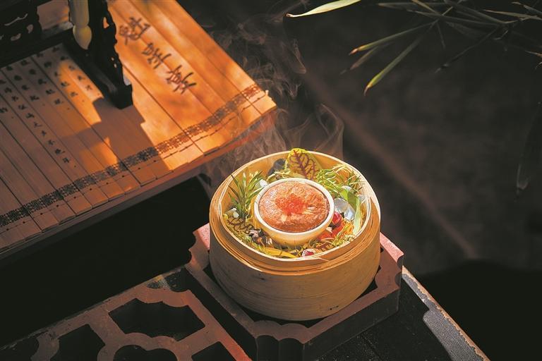 菜品“妙笔生花”中的“书页豆腐”选用五里街老豆腐切成薄片,清蒸后宛如展开的书卷,洁白的豆腐上点缀着各色食材,旁边缀以茭白笋做成的“笔”。当银筷夹起“笔”划过“书页”,让人遥想文人挥毫的风雅。