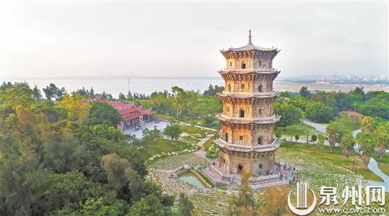 在离六胜塔不远处,万寿塔凌空矗立在石狮宝盖山上,是泉州湾海岸的制高点、古时“海洋大通道”的最主要航标。两座航标塔遥相呼应,既是为中外商船导航的地标,也是护佑商旅的精神寄托,构成泉州港独特的古代航海导航体系。