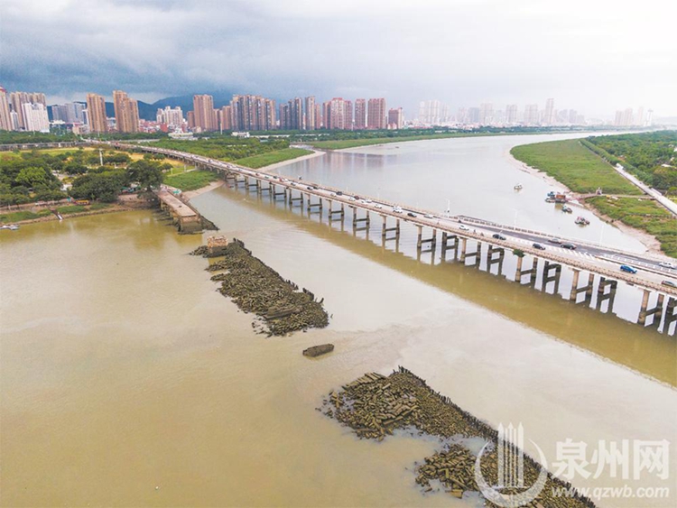 “顺济桥位置独特,与石笋桥共同构成横跨晋江的南北两座桥梁,与天后宫、德济门遗址景观共同体现了海洋贸易推动下古城南部商业性城区的发展,见证了商业拓展对交通系统的提升。”林志福说道。潮起潮落,晋江水奔涌不息。如今,顺济桥遗址还伫立江上,现存桥长约400米(包括部分桥面和桥墩11个),共有船型桥墩及桥墩遗址约30处,现存桥墩长约8.5米,宽约3.5米。