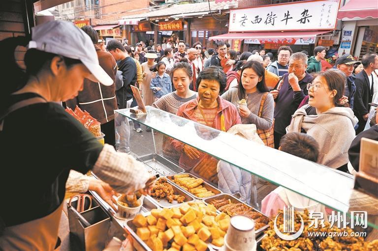 泉州市区西街,游客争相购买炸醋肉、炸菜粿等传统美食。(融媒体记者 陈晓东 摄影报道)