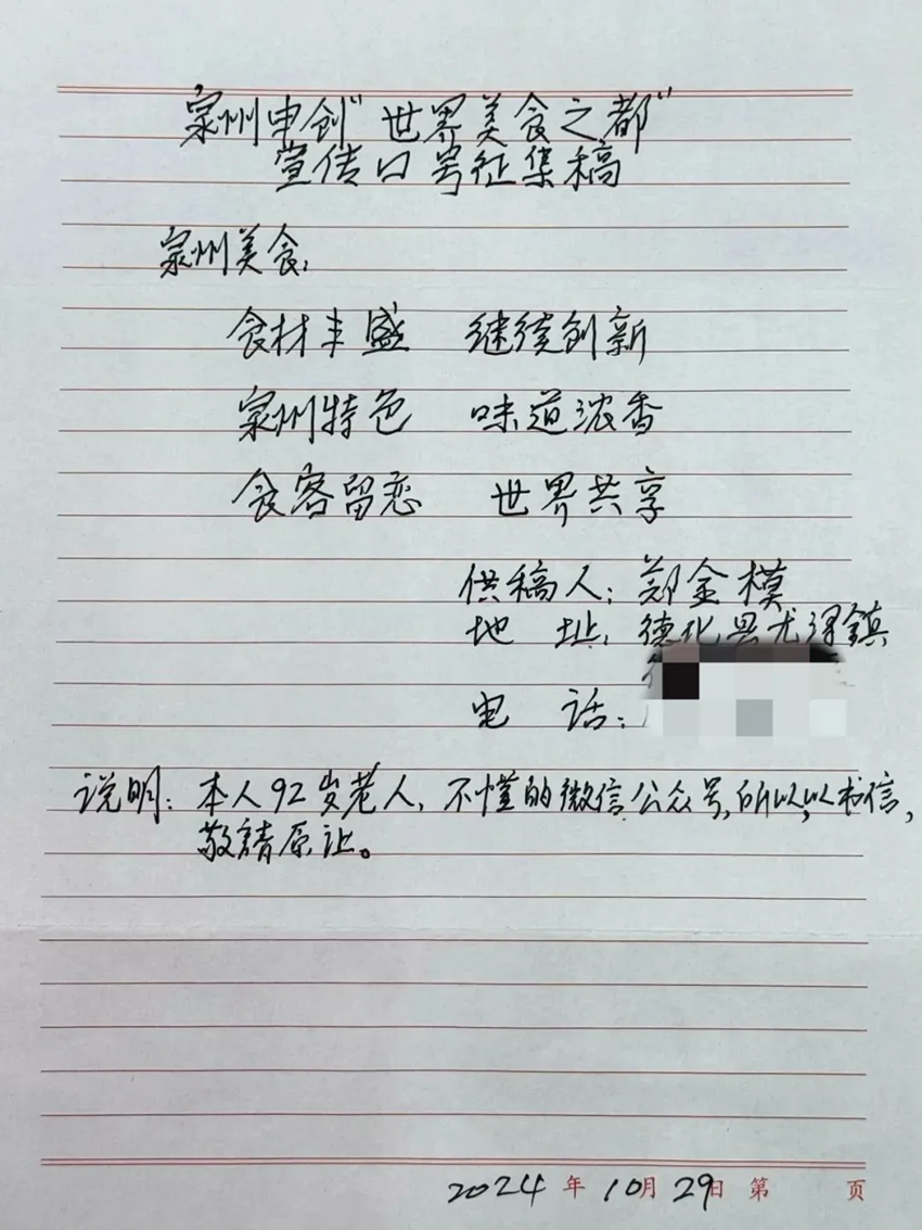 今年7月,泉州正式提出申创联合国教科文组织创意城市网络“美食之都”。为深化申创活动,打造极具泉州特色的美食IP,10月15日,申创世界美食之都宣传口号征集传播活动正式开启,历时一个半月,共收到来自全国30个省份228个城市及10条来自国外IP的共1750位参与者投稿的10488条投稿信息,此外,主办方还收到来自德化的九旬老人郑金模寄来的手写宣传口号内容。