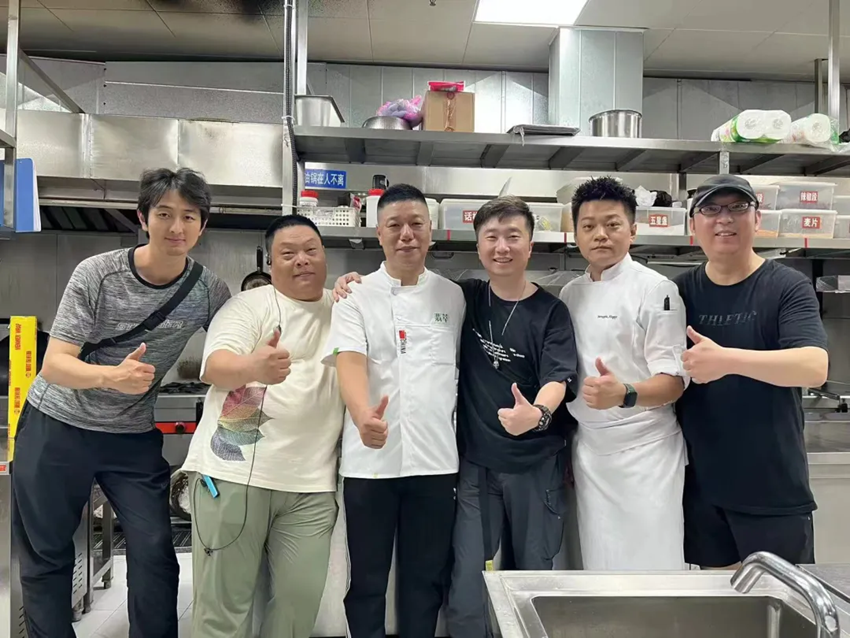 摄制组深入鲤酒琥珀后厨拍摄,并与林伟宏、吴俊雄两位大厨合影
