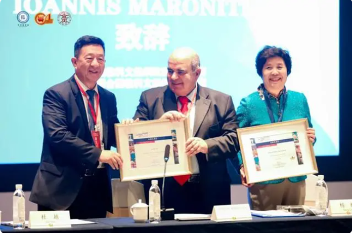 联合国教科文组织欧洲协会主席、希腊联合国教科文组织协会主席约安尼斯·马罗尼蒂斯(IOANNIS MARONITIS)授予荣誉证书(左一:杜越、右一:杨柳)